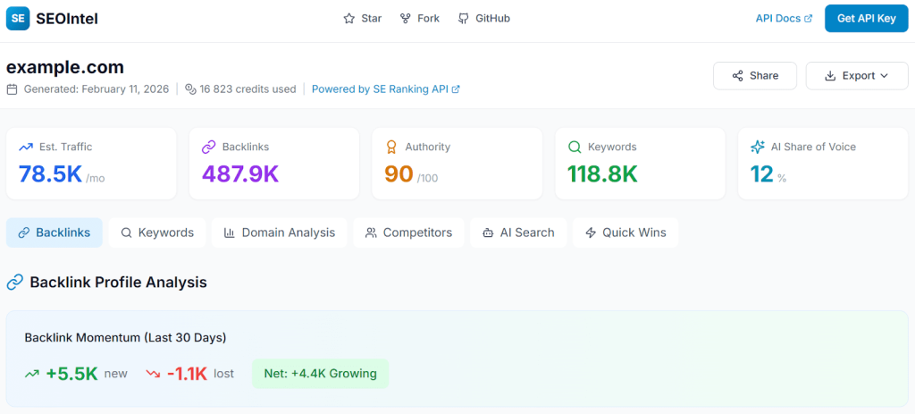 | Backlink Profile | Authority distribution, top anchors, backlink momentum (new/lost last 30 days), top linked pages, IP concentration | /backlinks/summary, /backlinks/authority/domain/distribution, /backlinks/anchors, /backlinks/history/count, /backlinks/indexed-pages, /backlinks/referring-ips |