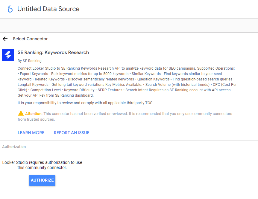 This guide provides step-by-step instructions for connecting SE Ranking as a data source in Looker Studio.