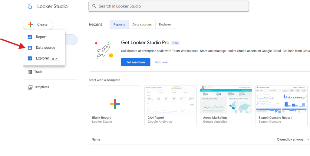 1. Navigate to Looker Studio and click Create in the top left corner, then select Data source.