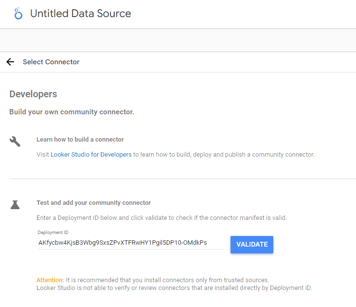 4. Click VALIDATE. Looker Studio will find the corresponding SE Ranking connector.