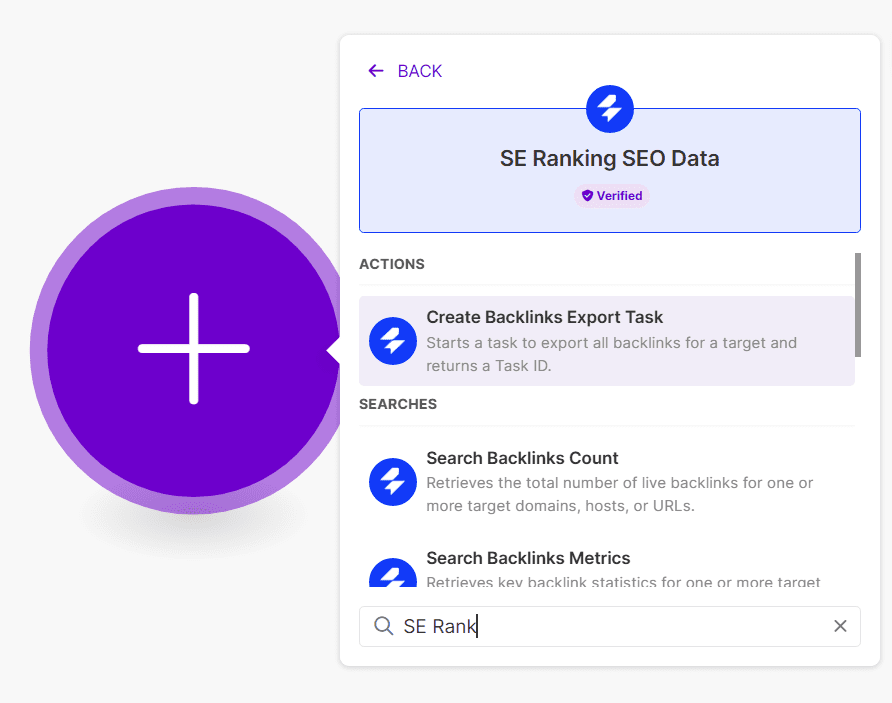 - In the module search bar, start typing SE Ranking and select the desired module, either from SE Ranking SEO Data or SE Ranking SEO Project, to add it to your scenario: