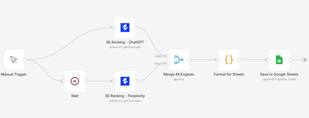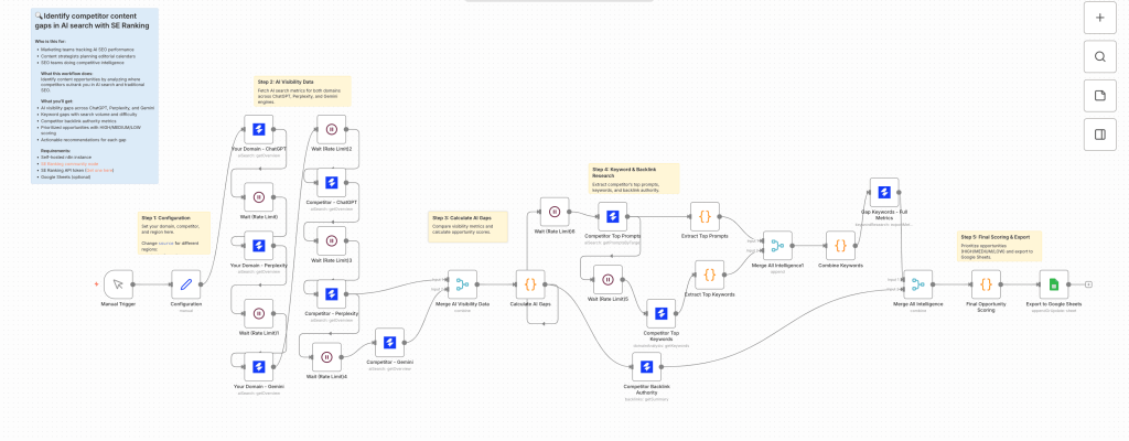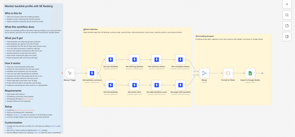 The SE Ranking integration with n8n automates SEO workflows by connecting the SE Ranking Data API to n8n pipelines. The integration supports AI search monitoring, backlink tracking, domain analysis, keyword research, and website audits.