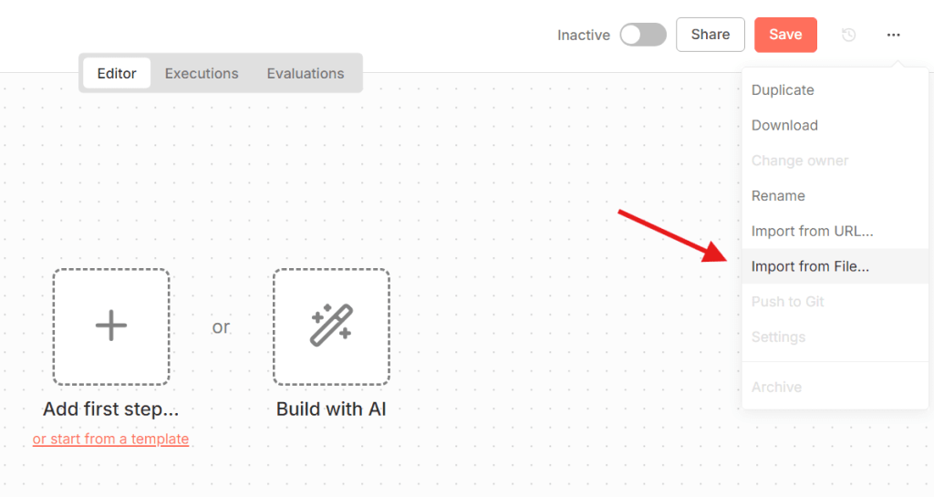 2. In n8n, open your workspace, click the three dots in the top right corner → Import from File, and select the JSON file: