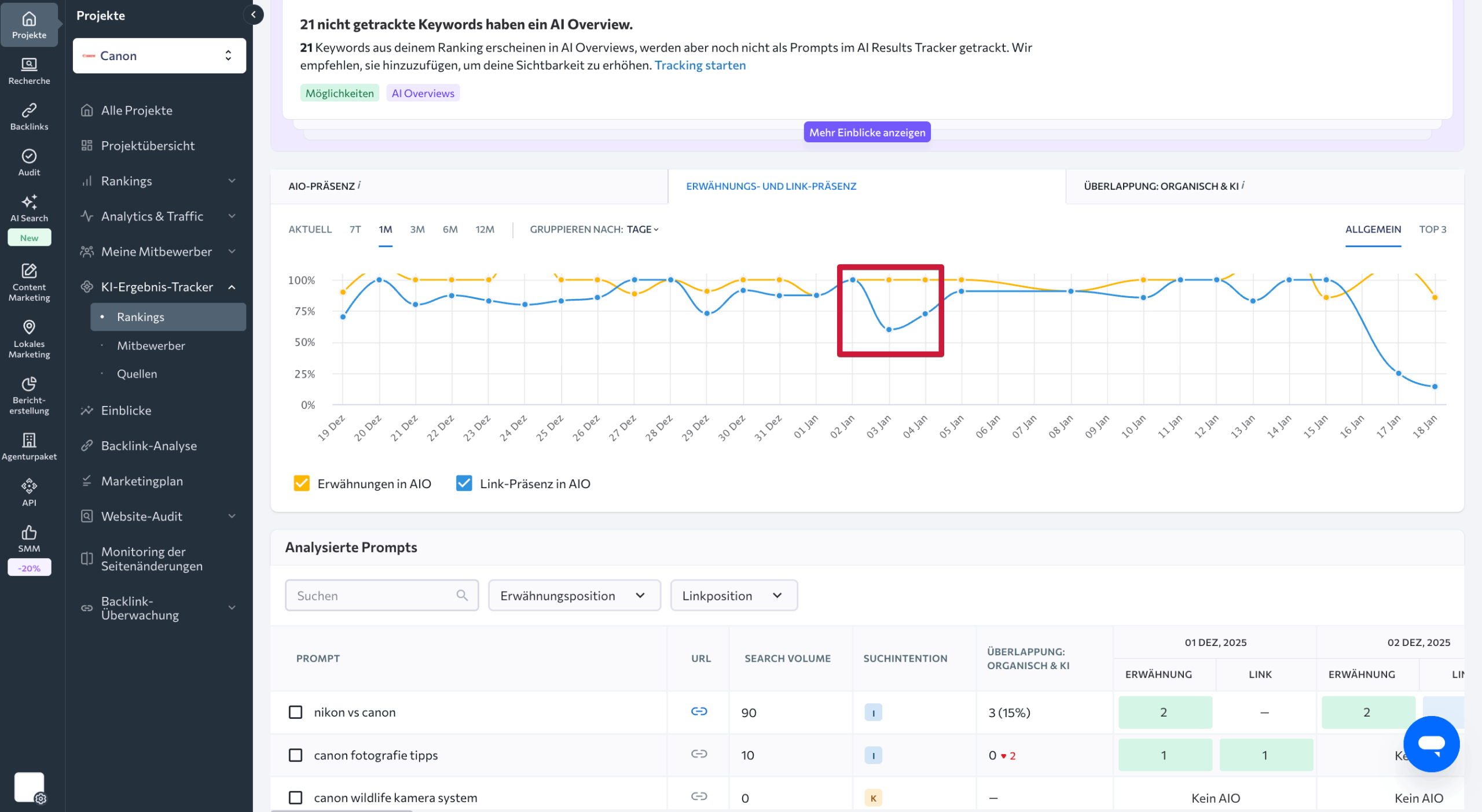 Um der Ursache auf den Grund zu gehen, kannst du die historischen Daten für diese Tage prüfen. Wähle im Kalender oben im Tab Rankings den entsprechenden Zeitraum aus. Du siehst dann tagesgenau, wie sich Positionen und Erwähnungshäufigkeit verändert haben und welche Prompts betroffen waren. In unserem Fall zeigt sich, dass bei drei von vier Prompts im AI Mode keine Links zur Ziel-Website mehr enthalten waren – bei einem Prompt ist der Link dagegen sogar um eine Position nach oben gerutscht.