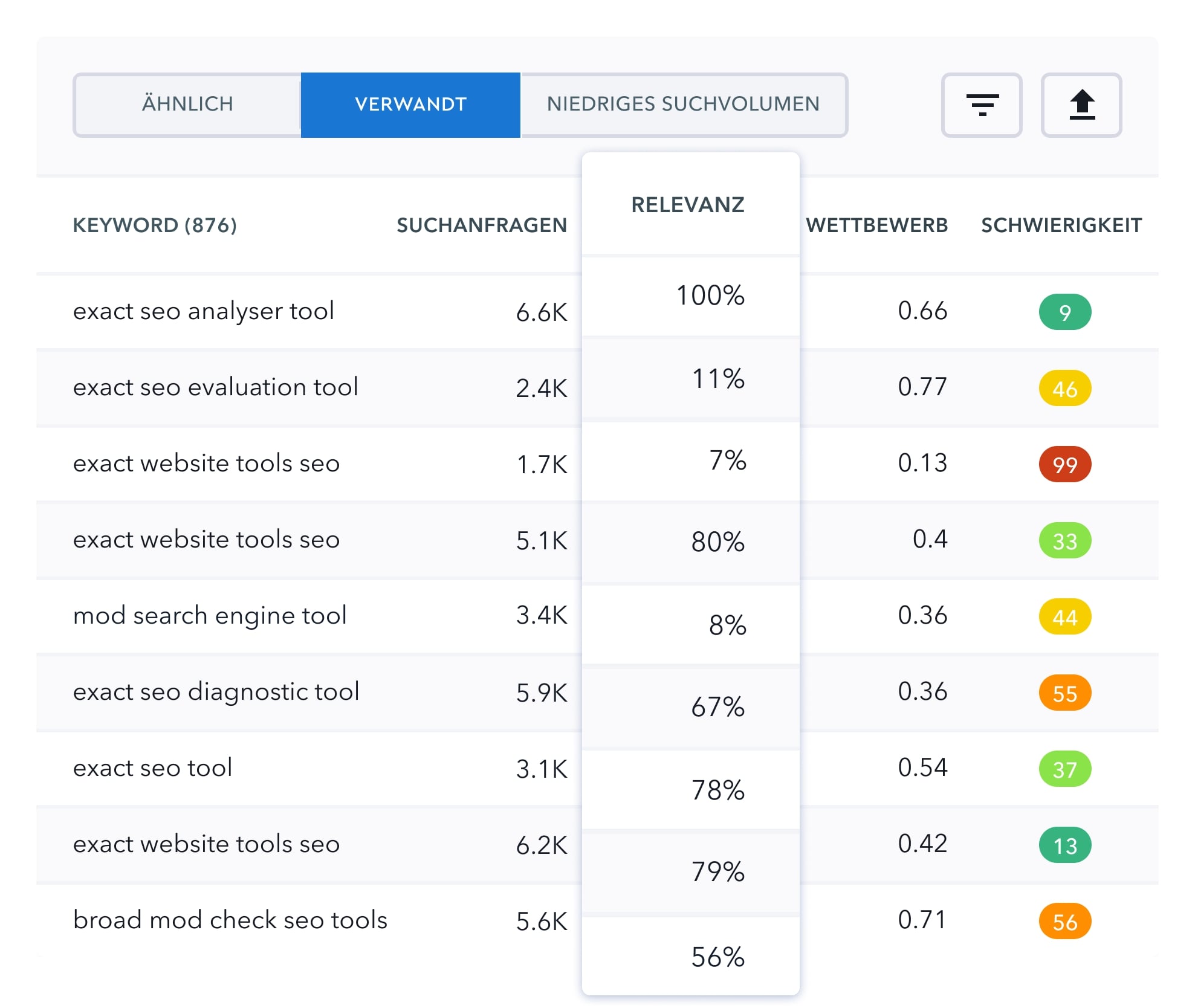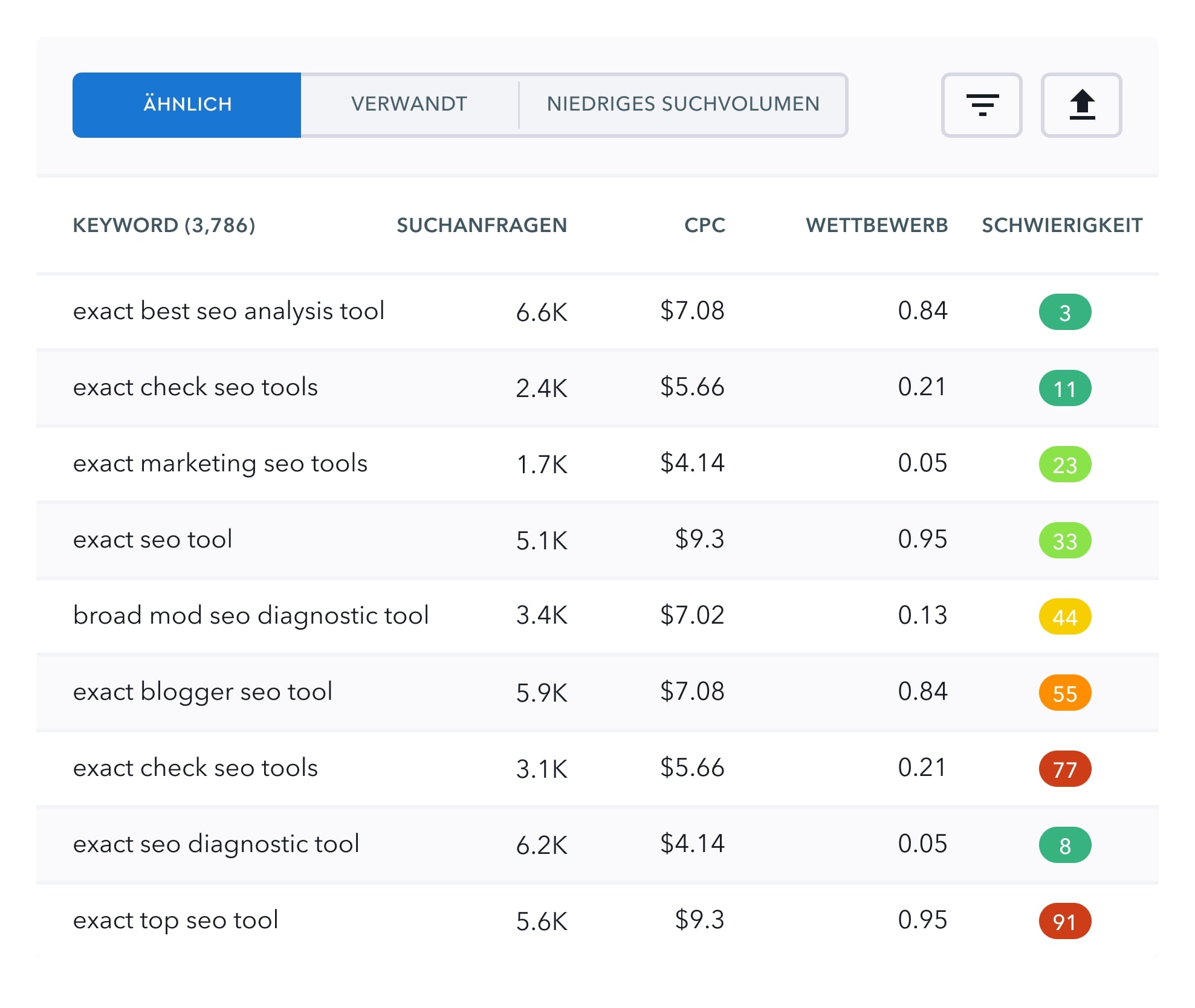 Unser SEO-Keyword-Generator zeigt dir ähnliche, verwandte und fragengestützte Keywords sowie Suchanfragen mit geringem Suchvolumen. Mit Filtern nach Wortanzahl, Schwierigkeit oder Suchintention findest du genau die Keywords, die deine Strategie nach vorne bringen.