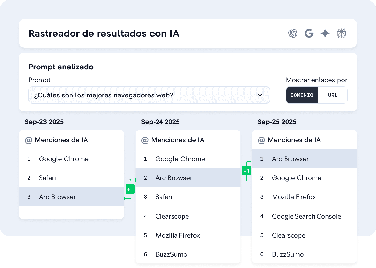 Mide la visibilidad de tu marca en los principales motores de IA, monitoriza menciones y enlaces, y compárate con la competencia