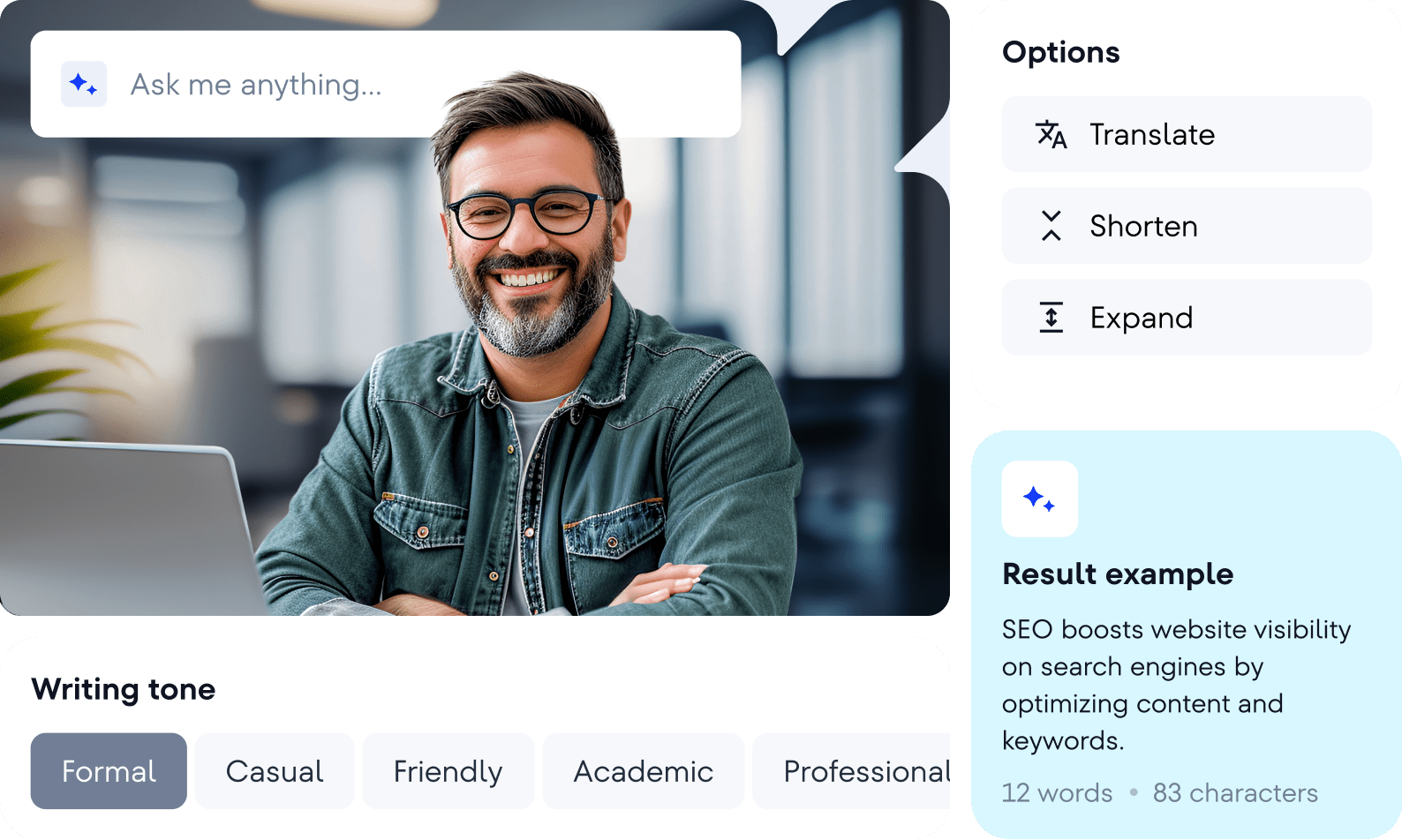 Crea metadescripciones optimizadas para artículos, páginas de producto, landing pages y cualquier tipo de contenido. Actualiza metadatos obsoletos, mejora la tasa de clics (CTR) y garantiza una comunicación coherente en todo tu sitio web. Trabaja más rápido y consigue más clics con menos esfuerzo.