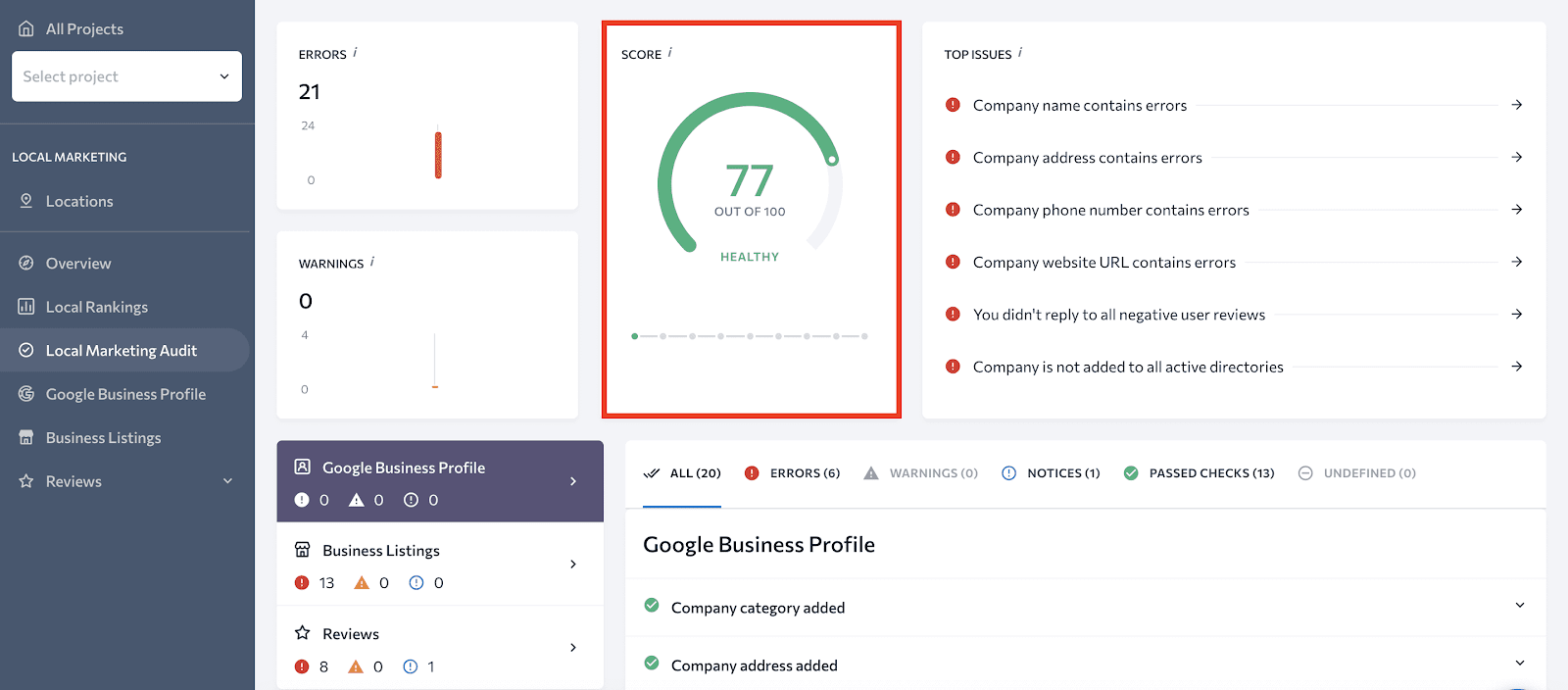 Le score de santé locale est disponible dans le module de marketing local de SE Ranking. Vous devez effectuer un audit local de votre site pour en obtenir la valeur. Après cela, vous verrez un chiffre de zéro à cent indiquant votre réussite.