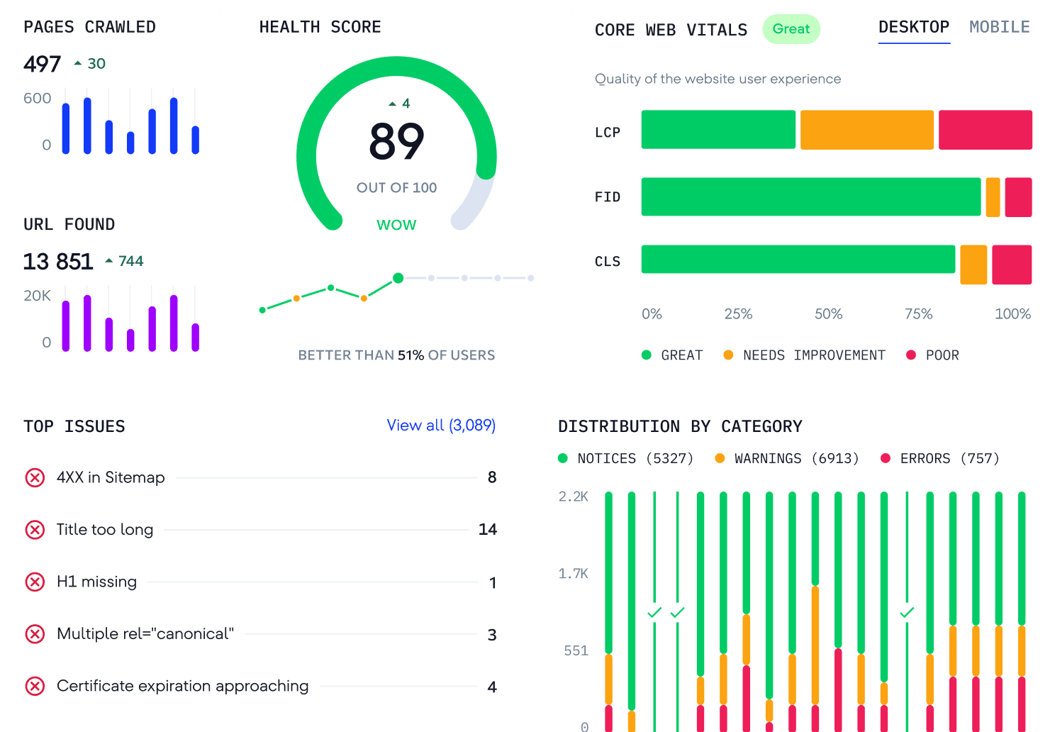 Spoor technische problemen op het gebied van bijvoorbeeld indexering, crawlbaarheid, paginasnelheid en Core Web Vitals op die de staat van de SEO van je website beïnvloeden.