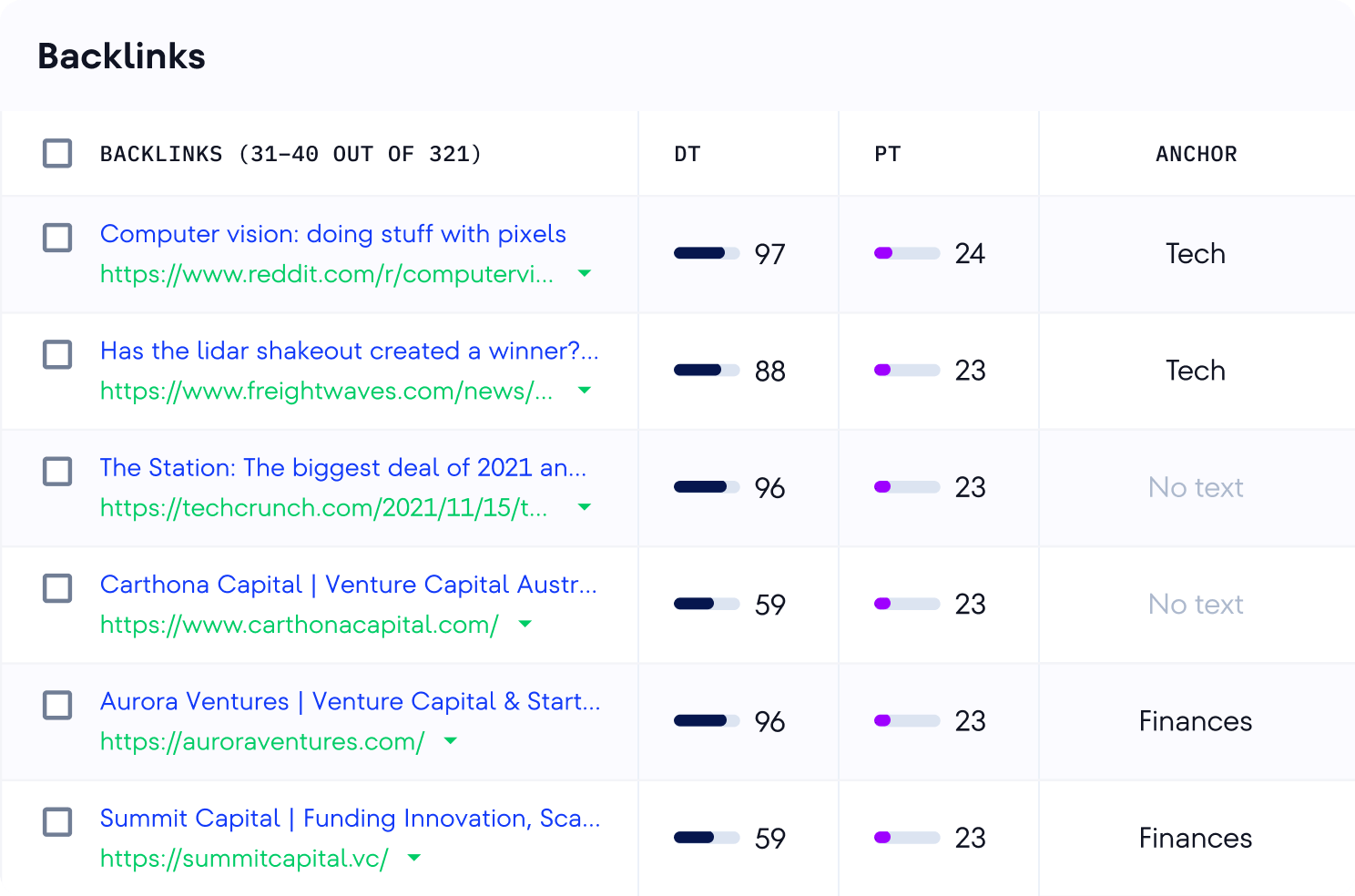 Met SE Ranking kun je jouw proces rond off-page SEO verbeteren. De tool analyseert backlinkprofielen en monitort de verkregen backlinks. Het biedt een constante monitoring van je links en waarschuwt je zodra een link verloren gaat of wordt aangepast. Ook kun je elk ander backlinkprofiel analyseren en anchors, soorten backlinks, domein- en pagina-autoriteit en soortgelijke linkparameters analyseren.