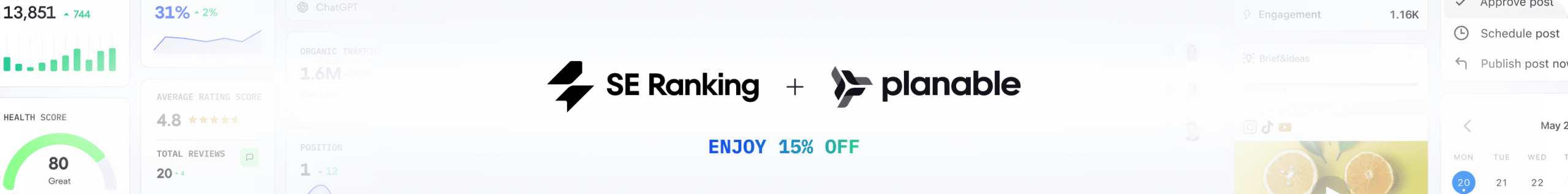 Stay visible where it matters — search, social media, and AI-driven answers. Pair SE Ranking with Planable for smarter growth. Enjoy 15% off any plan for your first 12 months for both solutions.
