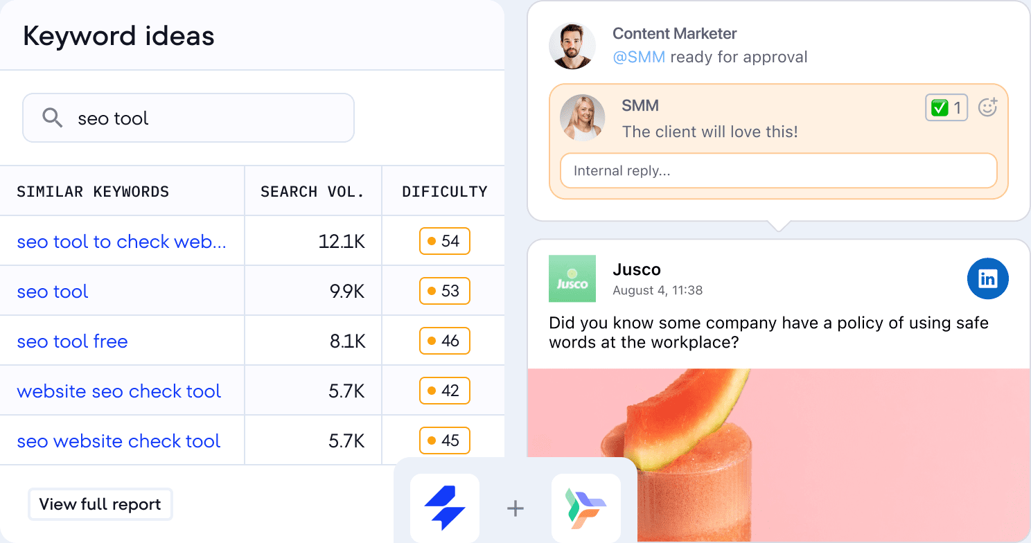 Plan and execute smarter campaigns. Run SEO research with SE Ranking to find keyword opportunities, create content briefs, and analyze SERPs. Use those insights for social with Planable. Align messaging, schedule posts, and streamline approvals.