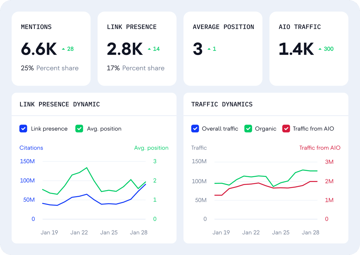 Analyze AI answers to your target queries, see who is mentioned, and whether your brand and website are featured.