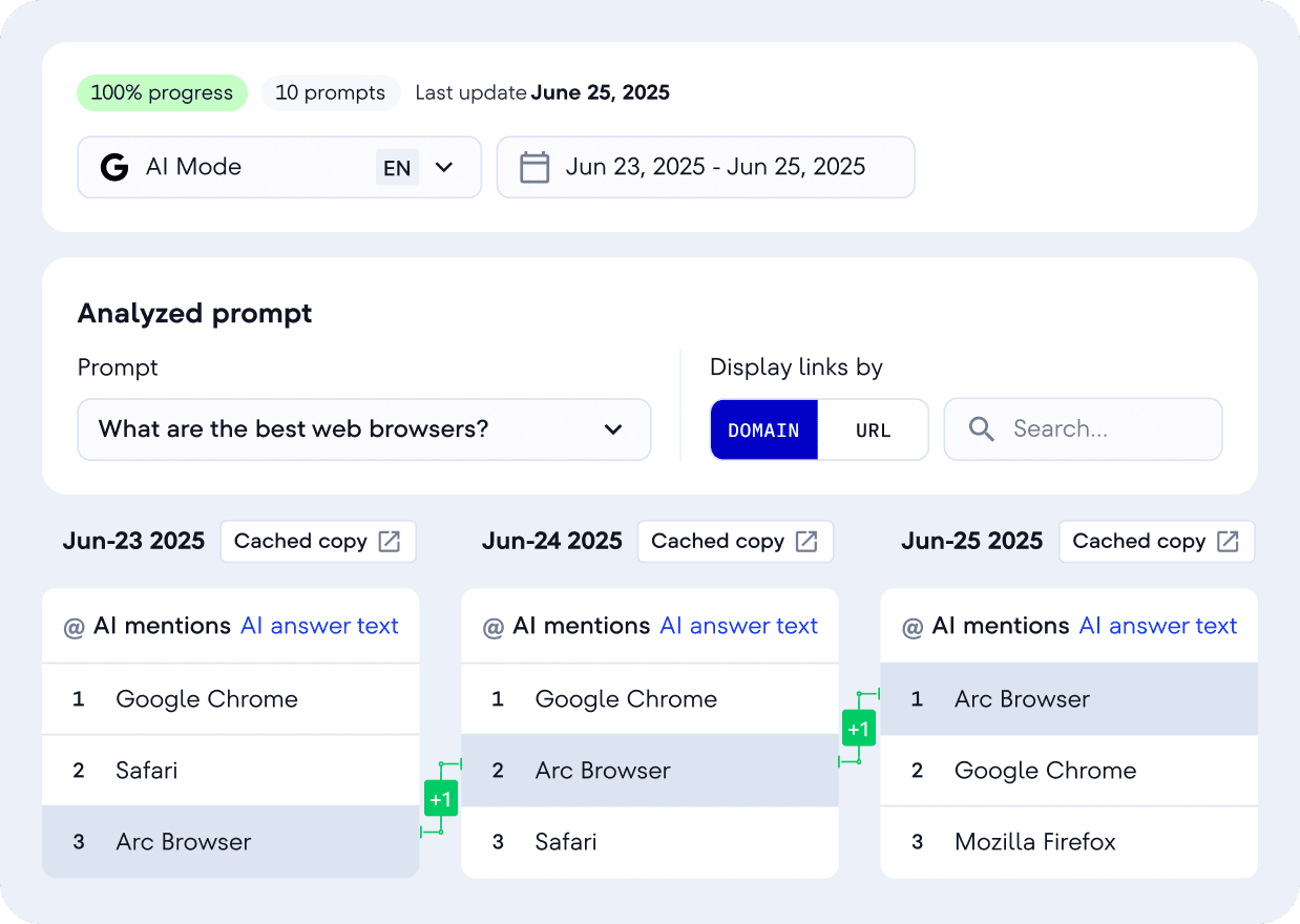 Evaluate any domain’s performance in AI-generated answers by AI Overviews, AI Mode, ChatGPT, and more